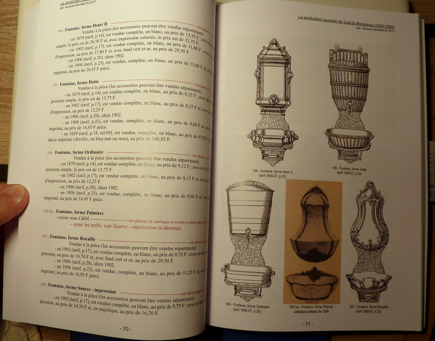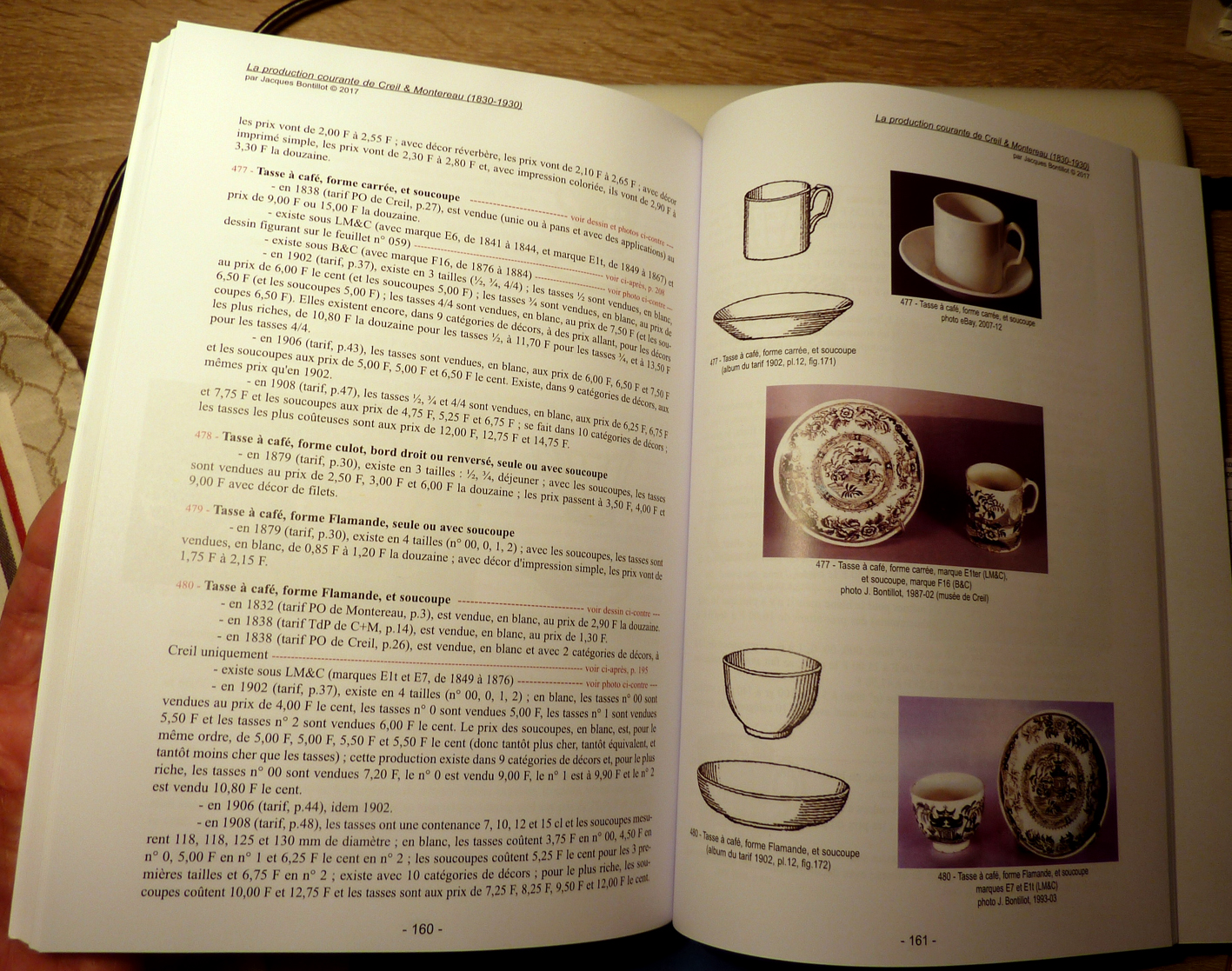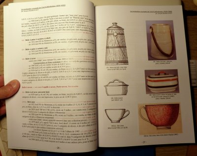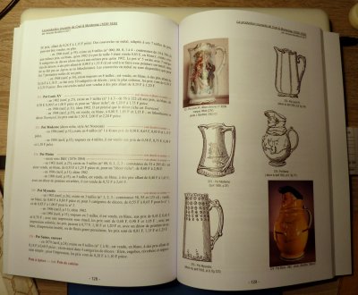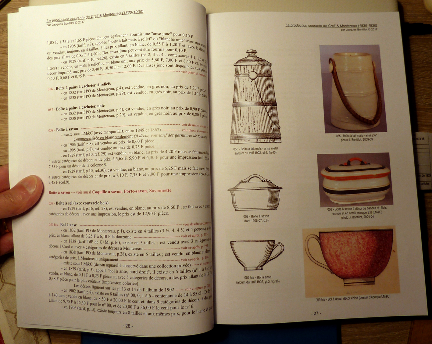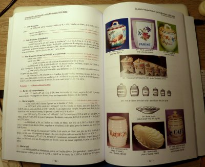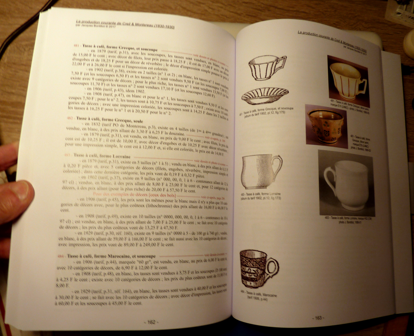 En un peu plus de 200 pages, ce répertoire contient donc 245 dessins, plus de 200 photos, la reproduction de 20 documents originaux, et la véritable dénomination de plus de 500 articles de vaisselle et autre faïence dite "courante" (en blanc ou décorée), de pièces de sanitaire et de toilette (en blanc seulement), de certaines pièces techniques, diverses ou décoratives, avec les prix qui leur ont été appliqués au fil du temps. Voyez quelques pages ci-après.